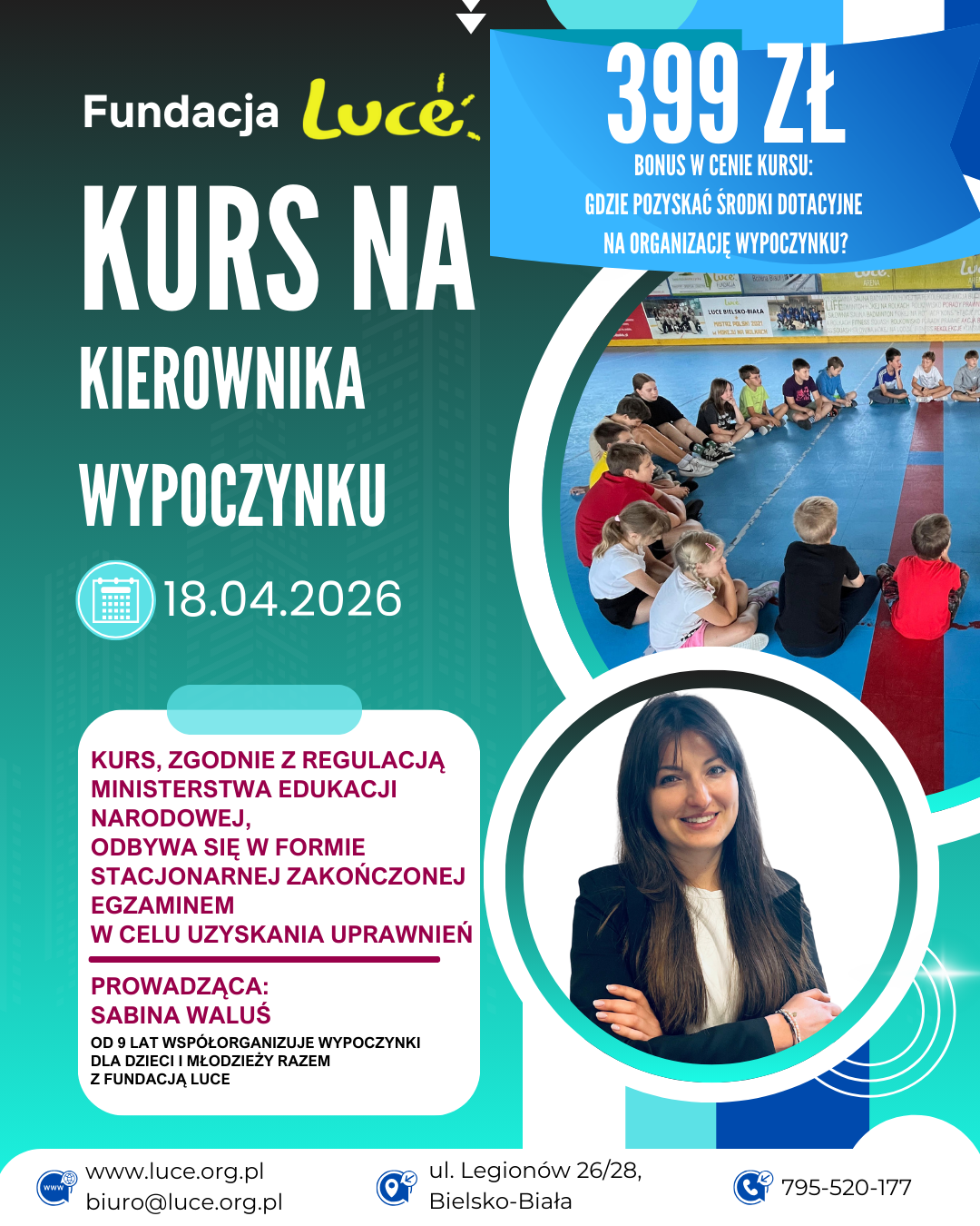 Planujesz pracę podczas kolonii, półkolonii lub obozów dla dzieci i młodzieży? A może chcesz zdobyć uprawnienia do kierowania wypoczynkiem? Zapraszamy na profesjonalne kursy organizowane przez Fundację Luce w Bielsku-Białej!