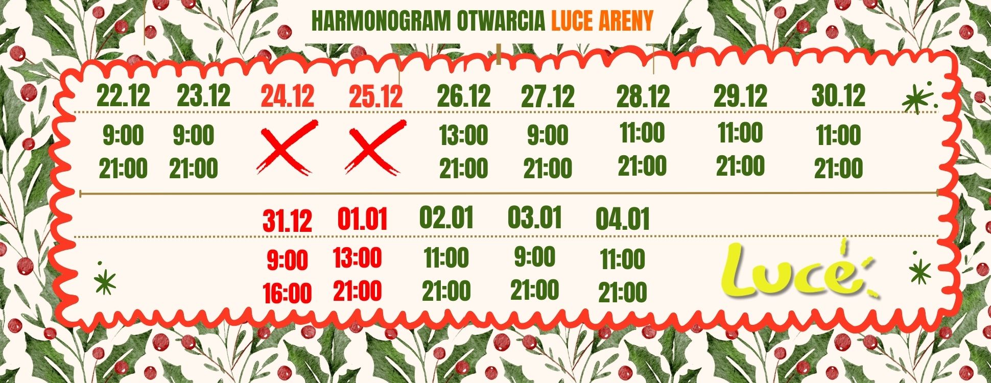 LUCE Arena jest obiektem sportowo — rekreacyjno — biurowym. W skład obiektu wchodzi rolkowisko – boisko wielofunkcyjnege z kortami do badmintona, kort do squasha, sale szkoleniowe do wynajęcia, sklep sportowy, stoły do tenisa stołowego, do futbolu stołowego i sauny (sucha i na podczerwień)